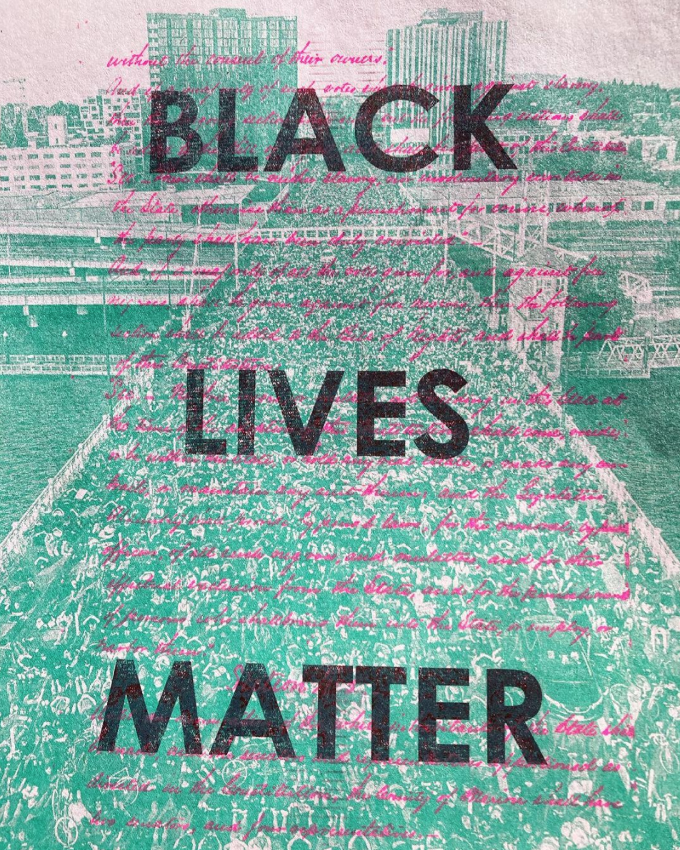 Three layer risograph print with Andrew Wallner photo, the Black Exclusion Laws page of the 1857 Oregon Constitution, BLACK LIVES MATTER